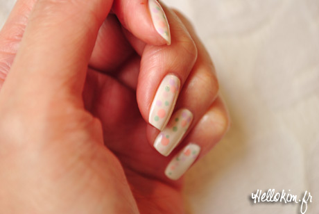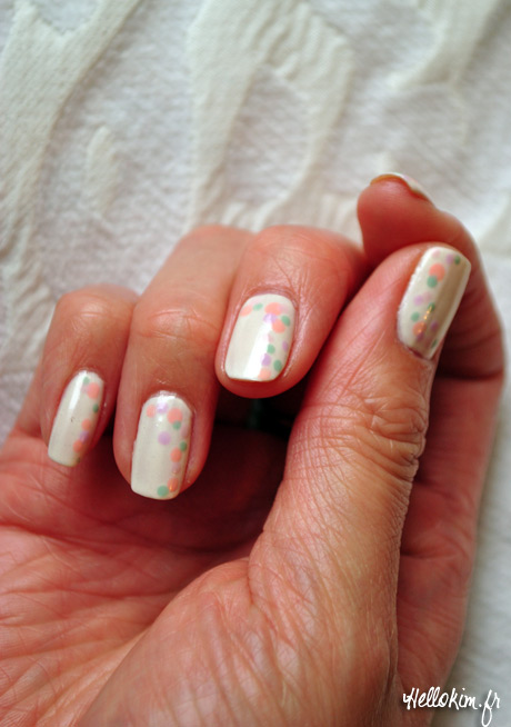 Nouvelle semaine, nouvelle manucure ! Cette semaine, c’est la fête et je sors de nouveau les confettis. Après la version avec un camaïeu de violets, c’est dans une version pastel multicolore que j’exploite ce motif à petits pois. Sur ce, je vous souhaite une belle semaine ! Demain c’est mon anniversaire !