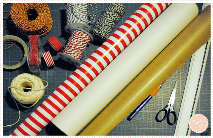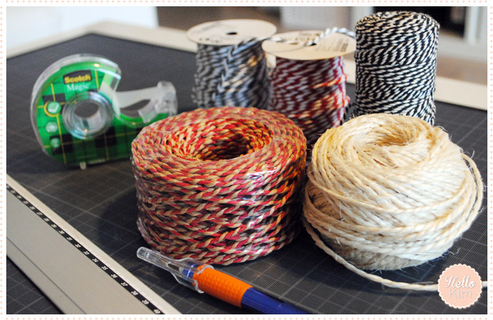 – Du baker twine ou de la simple cordelette qu’on trouve au supermarché ou dans les magasins de bricolage pour fermer les bonbons et pour suspendre les paquets
