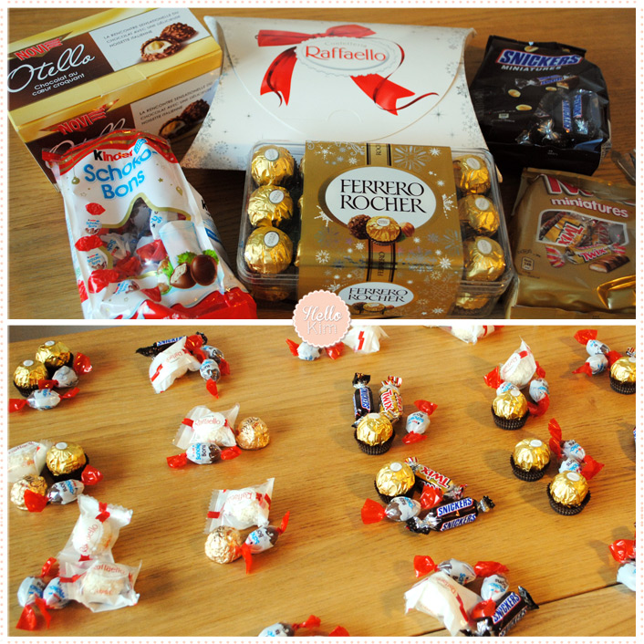 Comme je m’y suis prise un peu tard, je n’ai pas pu réunir seule les 24 rouleaux de papier, j’ai donc demandé de l’aide auprès d’amis et collègues grâce à qui j’ai fini par réunir 20 rouleaux la semaine dernière. Concernant les surprises, j’ai acheté pas mal de chocolats en bouchées pour garnir mes petits paquets : Ferrero Rocher, Raffaello, Otello, mini Snikers, mini Mars et Schoko-bons ! J’en ai eu pour 16€ de courses. Comme nos rouleaux n’étaient pas tous de la même taille, on a alors fait 24 petits lots pour se charger d’abord des petits lots.