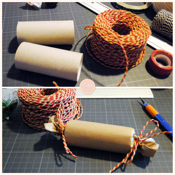 Et donc c’est vraiment tout simple. On coupe des morceaux de papiers (25 x 20cm), on garnit les rouleaux d’autant de surprises qu’on veut et ensuite on enroule les rouleaux de papiers décoratifs. Pour fermer le tout, il suffit de faire des nœuds de part et d’autre avec de la ficelle (environ 35cm) et voilà le travail. Si vous utilisez du papier sans motifs mais que vous voulez égayer, n’hésitez pas à faire comme moi et décorez le papier avec du masking tape/scotch décoratif.