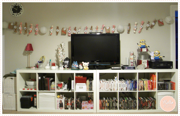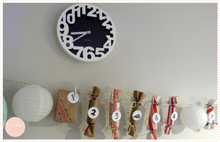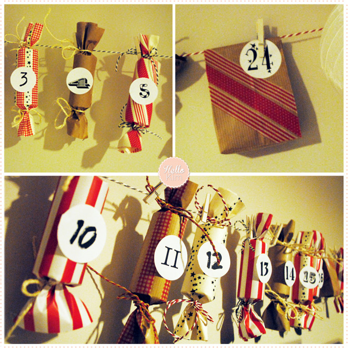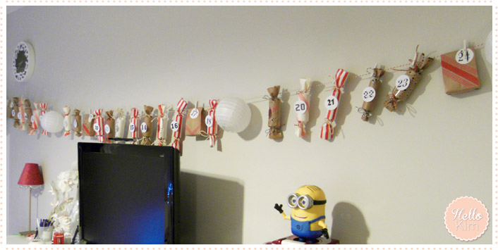 Salut les coquinous ! Ceux qui me suivent via Twitter savent qu’il y a encore 10 jours je n’avais pas encore fait mon calendrier de l’avent et que je n’avais d’ailleurs aucune idée de ce que j’allais faire. Et puis j’ai eu une idée, enfin une moitié d’idée… L’année dernière, j’avais fait mon tout premier calendrier de l’avent en suspendant via une cordelette 24 petits paquets en papier kraft (faits maison eux aussi). Comme j’ai adoré l’idée de faire de ce calendrier une décoration à part entière j’ai voulu renouveler l’opération. La question était de savoir comment refaire la même chose mais différemment ? Je me suis dit qu’il suffisait de changer le format des petits paquets. Alors cette année, au lieu d’avoir un alignement de 24 paquets, j’ai dans mon salon une vingtaine de gros bonbons !