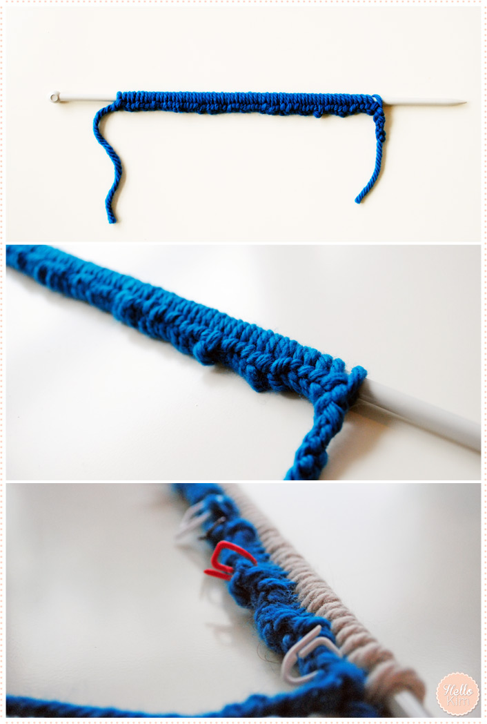 Après le mini snood que j’ai fait pour la petite choupine d’une de mes amies, je me suis lancée dans un snood pour moi. J’en avais eu l’idée l’hiver dernier après avoir fait un snood pour mon Homme. Le modèle que j’avais réalisé me plaisait tellement que j’avais vraiment envie de me faire une déclinaison pour moi. J’avais acheté la laine pendant les soldes d’hiver chez Phildar mais par manque de temps et parce que je ne tricote pas quand il faut chaud (il ne faut pas déconner non plus), et bien je ne me suis penchée sur la question qu’à la rentrée. Profitant d’un planning assez léger côté sorties avec mes copines, je me suis lancée dans la confection de ce snood en introduisant 2 techniques qui m’étaient inconnues jusqu’ici : le montage provisoire et le grafting. Pour le montage provisoire, c’est très facile mais il faut avoir un crochet sous la main car il s’agit de monter des mailles chainettes autour de votre aiguille à tricot. Pour mon snood que j’avais prévu gris-beige, j’ai fait mon montage provisoire avec une laine de couleurs contrastée mais de taille identique.