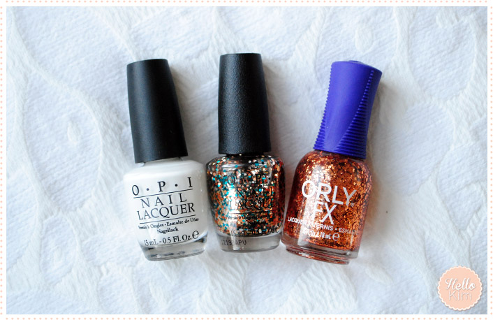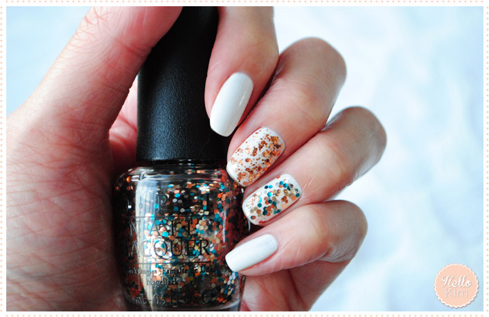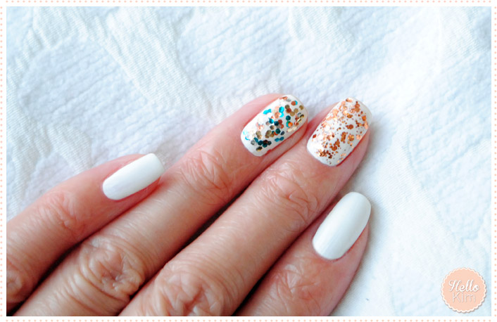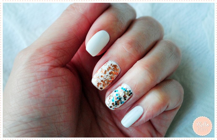 Nouvelle semaine, nouvelle manucure ! A l’occasion du Réveillon de la St Sylvestre j’ai sorti plein de paillettes ! Bon, je vous avoue ne pas avoir eu beaucoup de temps pour faire cette dernière manucure de l’année 2013 et comme je manquais aussi d’inspiration, les paillettes tombaient à pic ! Je voulais tout de même quelques chose de festif sans être trop tape à l’œil et voilà le résultat !