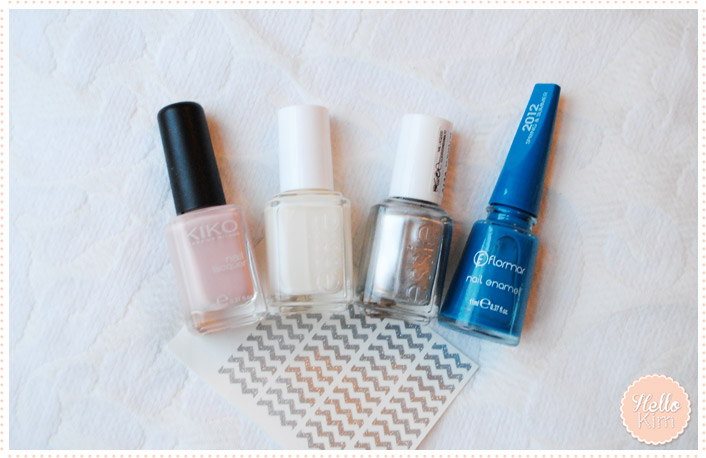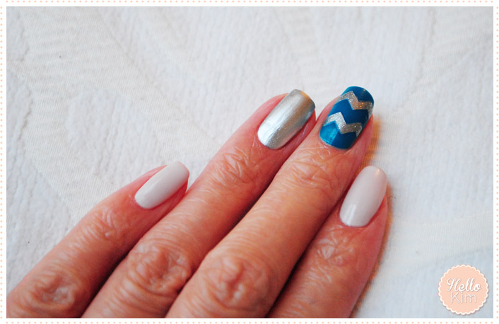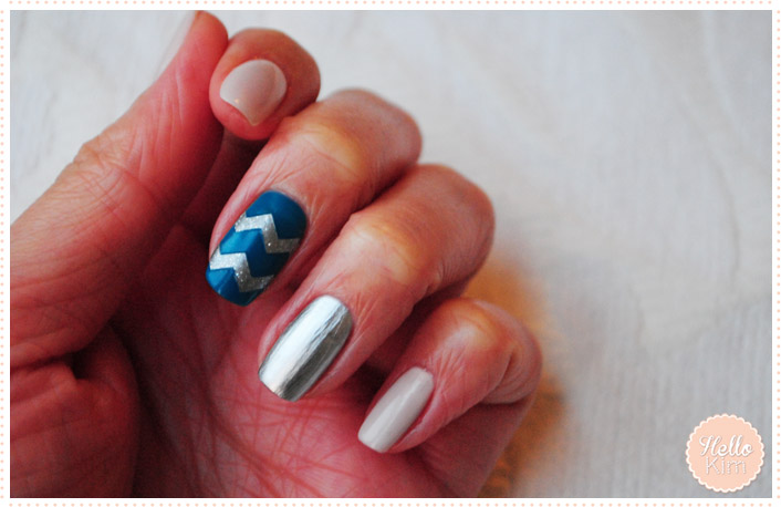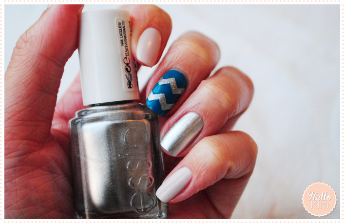 New week, new manicure! Continuing in my launched « my chrome nail polish is too beautiful, » I have this week introduced silver stickers with chevron pattern bought several months ago at Make it stick at the same time as the white versions that you saw here and there. For this nail art, I put my silver stickers on one nail with a blue base and a nail with my nail polish No place like Chrome of Essie. For other nails, I first put a layer of nude Kiko to give an opaque base and then 2 layers of pearly-white Essie.
