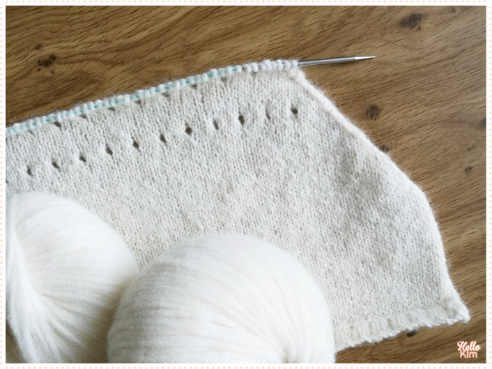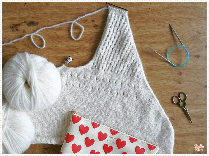 Comme je déteste l’assemblage, j’ai pensé les étapes de telle sorte à limiter le nombre de coutures et c’est comme ça que j’ai tricoté les devant et le dos en un seul morceau, avec des aiguilles circulaires et un câble de 100 cm.