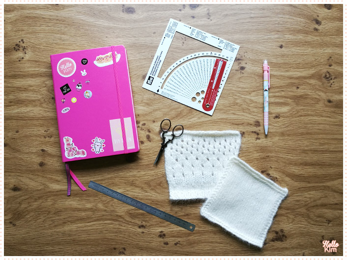 Pour la coupe, je lui ai conseillé quelques chose de bien plus ajusté pour mettre sa silhouette en valeur et on a opté pour un modèle type cache-cœur. Après avoir pris ses mensurations, j’ai fait un croquis de l’ouvrage, des calculs dans tous les sens pour convertir les centimètres en nombres de mailles et rangs, et c’était parti !