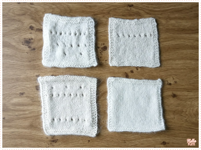La future mariée voulait un modèle duveteux, ajouré et super loose. Pour le fil, avec la complicité de Natalie du site 1001laines.com j’ai réalisé quelques échantillons à partir d’une sélection de fils Drops.