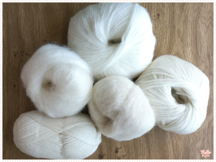 On a retrouvé le côté duveteux avec la Drops Air dont la fibre est aussi légère que chaude. J’avais aussi testé les fils Drops Brushed alpaga silk, la Drops Kid silk et la Drops Sky mais les coloris « naturels » étaient trop foncés pour le blanc de sa robe (sur la photo, on distingue à peine les nuances je vous l’accorde) et le coloris blanc allait être bien trop blanc.