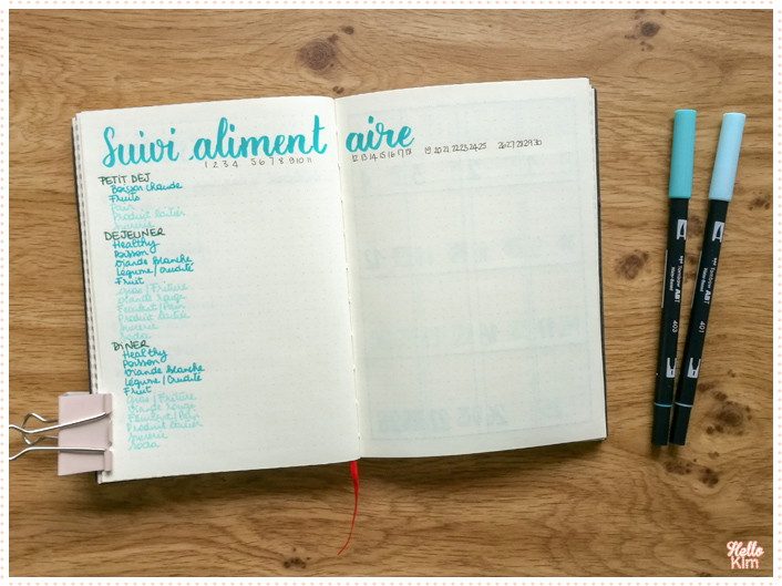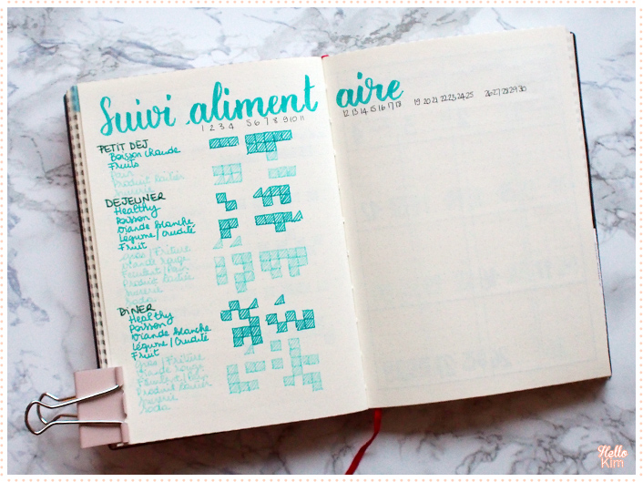 Côté alimentaire, c’est le gros bazar dans mon assiette. Je suis ultra gourmande avec un net penchant pour le gras et le chocolat. Comme j’ai plus 20 ans, mon corps me fait payer mes écarts alors j’essaie de faire attention (mais la raison est pas mon point fort quand c’est mon estomac qui prend les rênes). Il parait qu’on consignant ce que je mange, ça peut m’aider à ouvrir les yeux et à faire de meilleurs choix… Moi je colorie des cases avec une couleur pour ce qui est plutôt bénéfique et une autre les choses qui le sont un peu moins (voir carrément pas).