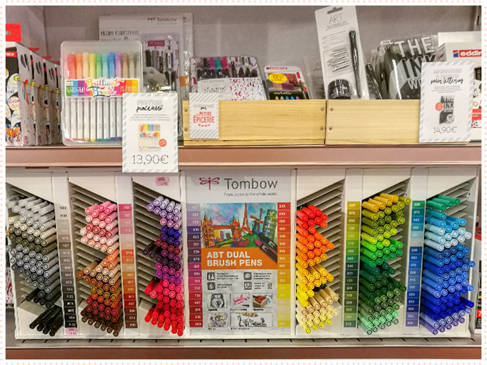 J’ai aussi craqué pour les TwinTone pastel de Tombow trouvé sur le stand de La Petite Epicerie, du masking tape doré, et un tampon encreur que je vais pouvoir personnaliser avec mon logo.