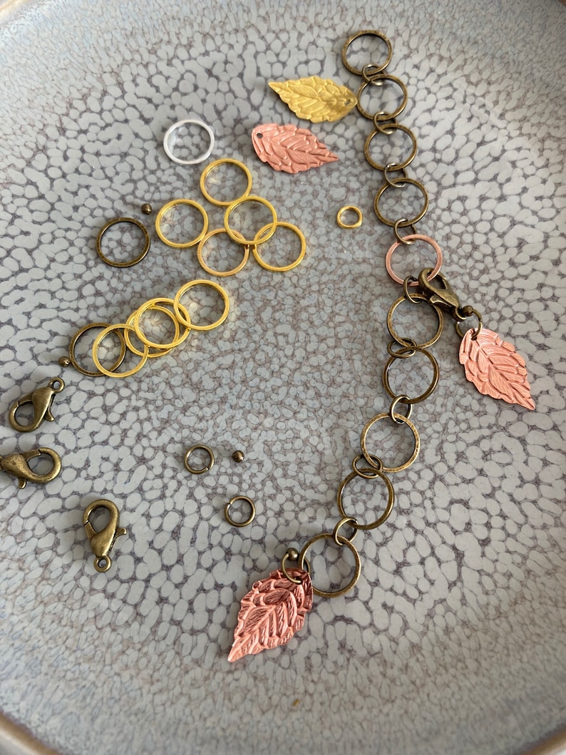 J’ai vu récemment un autre type de compte-rangs manuel très joli qui peut s’apparenter à un bijou. Il s’agit d’une succession de 10 anneaux reliés en eux. Chaque anneau représente un rang et en glissant le compte rang sur les aiguilles, d’un anneau à l’autre, on marque le nombre de rangs ou tours tricoté.