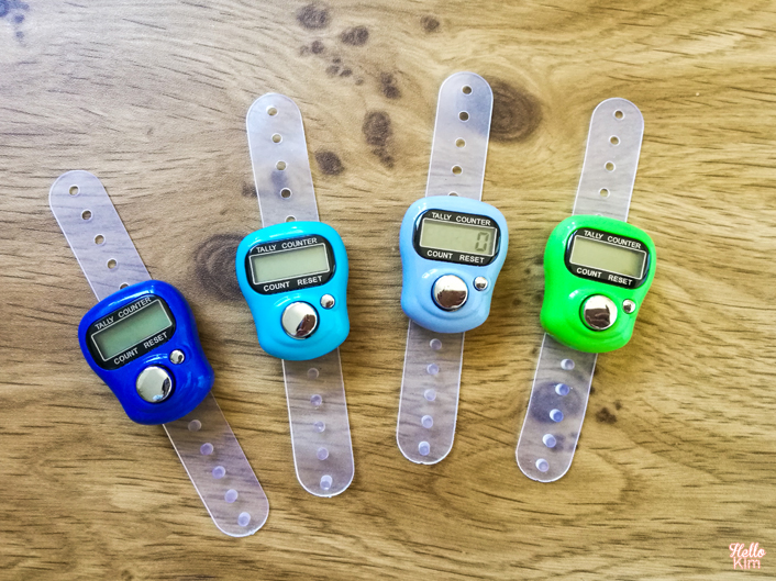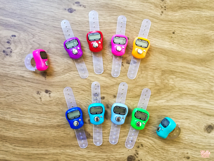 Le compteur de rangs électronique est un tout petit boitier électronique qui mesure environ 3,5 x 3 x 1,6 cm composé d’un écran digital et de 2 boutons. À l’arrière du bouton, il y a une sangle en plastique ajustable. Moi je le passe à mon index gauche.