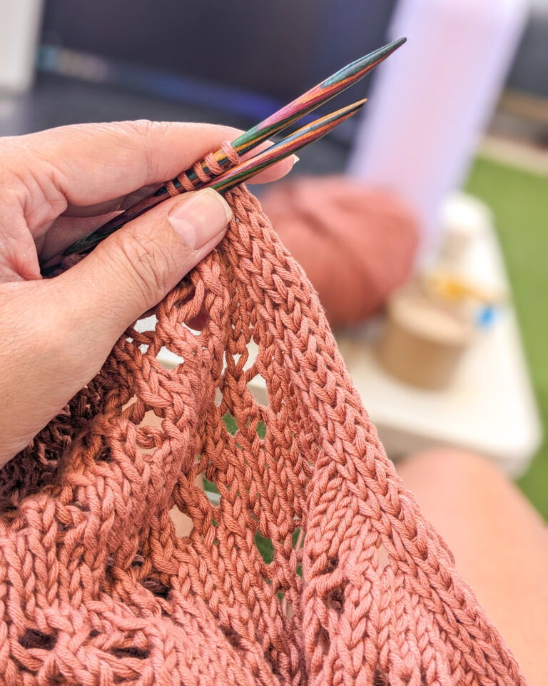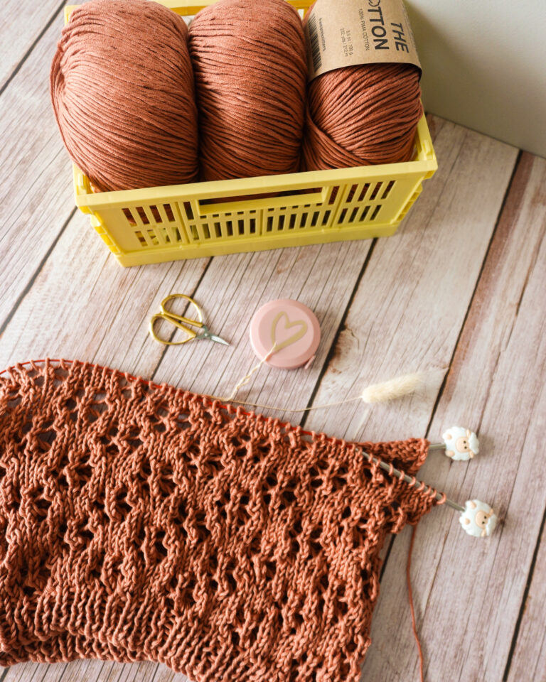 👉 Faire l’échantillon en motif ajouré plutôt qu’en jersey, pour mieux anticiper la taille finale du tricot.