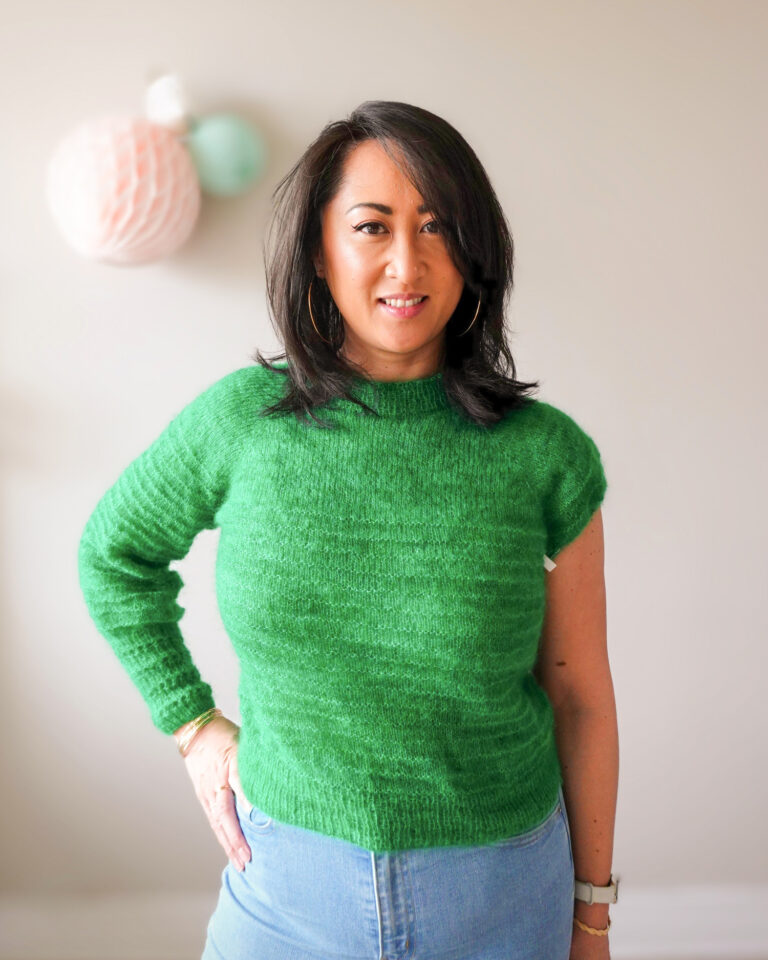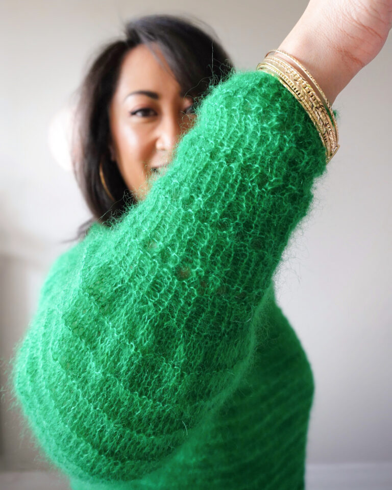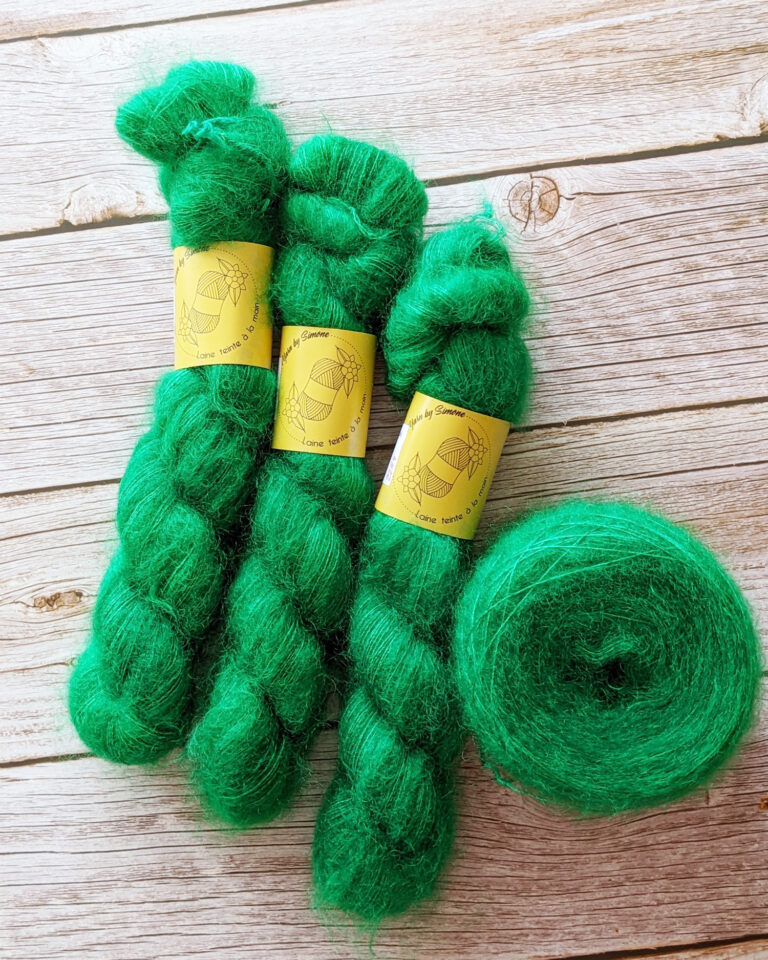 Pour réaliser mon Pull Pigne, j’ai choisi la même qualité de fil qu’Emilie : Kid Mohair & Soie de chez Yarn by Simone. Lors du salon Créations & Savoir-Faire, j’ai eu un coup de cœur pour le coloris Vert Jingle Bells, bien que le vert ne soit pas ma teinte habituelle !