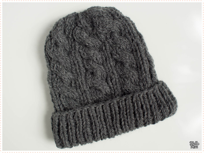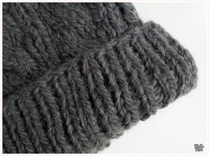 Il est composé de côtes 1/1 pour la base à revers puis de torsades séparées par quelques mailles tricotées en jersey. Pour parfaire son look, j’ai ajouté un pompons noir. Il est assez haut pour le porter façon slouchy.