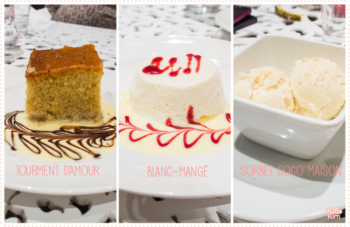 Après tout ça et sans oublié un cocktail, nous n’avions plus tellement faim mais l’appel du sucré était plus fort que nous. Nous avons alors craqué pour un Tourment d’Amour (quatre-quart antillais- cannelle et vanille, fourré à la confiture de Coco, nappage Abricot), d’un Blanc-manger coco (Entremet sucré à la noix de coco) et de sorbet coco fait maison. Tellement bon…