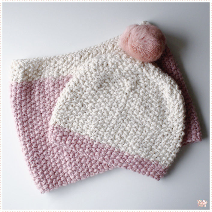 Pour le bonnet, j’ai aussi commencé avec le fil rose pour une petite bande et j’ai continué avec le fil écru. Pour paufiner le look de cet ensemble, j’ai ajouté un pompon déniché au Japon lors de mon voyage en 2014. Et tadam !! Vous en pensez quoi ?